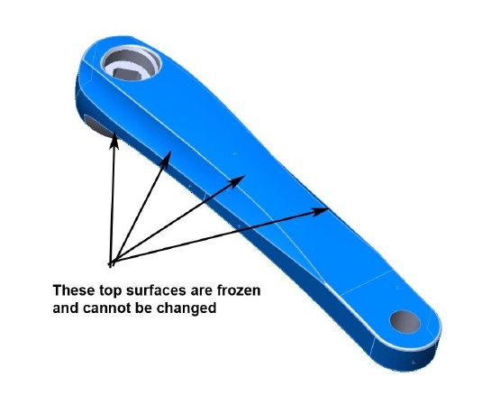 Rear side of the crank arms are aim for the modifications. See blue shaded surfaces in the images. Reference surfaces are added as 3D files for reference. These bottom surfaces are the target area for reduction for weight reduction.