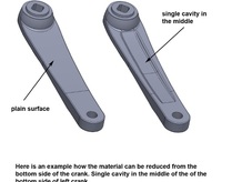See example how the material can be reduced from the bottom side of the crank: Single cavity in the middle of the of the bottom side of left crank.