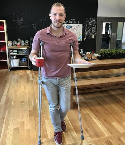 We have a man down here in the GrabCAD office. Our Director of Products and Support, Grant, was recently injured playing ultimate frisbee. He fractured his tibia and has been on crutches for the past two months relying on his colleagues and friends to assist with carrying items for him. After speaking with Grant he shared his obstacles of using crutches. The most irritating one of all was trying to carry food and/or a drink from the kitchen to his desk or while at home. We thought of a great idea to make this into a Challenge and leave it up to the Community to design two accessories he can attach to the crutch to carry his food and a drink without spilling.