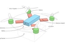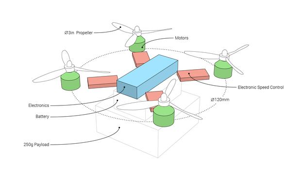 1. Must hold electronics, electronic speed controllers, motors, battery and payload in positions detailed in CAD file here: Quadcopter Design Files (with one exception - the distance between the battery and electronics is not defined and can be altered by you, the designer)