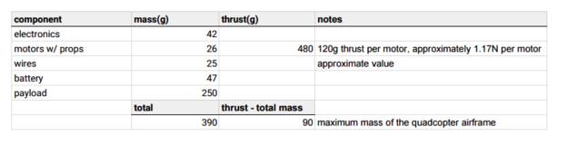 If the motors produced 480 grams of thrust collectively, and the total AUW (including payload) is 480g, how on earth is this thing going to actually take off with that payload? T/W is 1:1 therefore it can not accelerate, take-off, or barely hover. Without the payload, the T/W is 480/230 (~2:1) not the best for a multi-copter. the T/W should be at least 2:1 when fully loaded, not empty. I typically prefer at least a T/W of 3:1 or 4:1 for appropriate control authority.