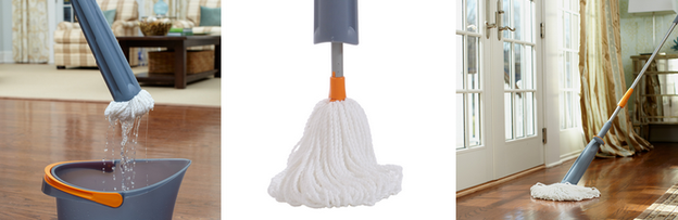 Develop a new method to wring a string mop, without the need of a bucket. String mops have been around for a long time. There are basically three ways of squeezing the water out of them: pressing the strings against a basket in a bucket, twisting them or more recently spinning them on a rotating basket in a bucket. We are looking for a innovative way of wringing the strings without the need of a bucket, and different from the current twist mops.