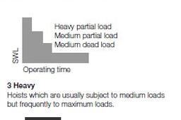 Selection criteria of FEM group of hoist The size of the hoist is determined by the load spectrum, average operating time per working day, SWL(Safe Working Load) and reeving. 1. What are the operating conditions? 2. What is the specified SWL? 3. To what height must the load be lifted? 4. What is the required lifting speed? 5. Do the loads need to be lifted and lowered with high precision? 6. Is horizontal load travel necessary? 7. How is control to be effected? The load spectrum (in most cases estimated) can be evaluated in accordance with the following definitions: