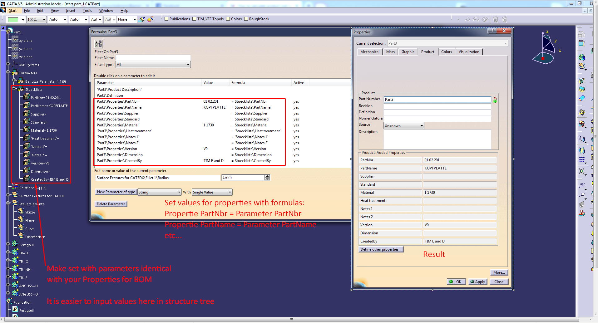Please find on picture below tip for easier edit of Properties via Parameters in specification tree. Ofc, you need to make this on your "start part" (template) and use it later with File/New From for all of your CATParts in project.