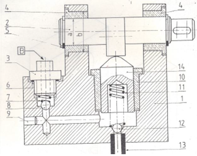 Its a volumetric circulation pump with inlet in load: 13 is the inlet hose, 12 is the inlet non-return valve, 14 the metering piston, 2 its actuating cam shaft, 8 is the output non-return valve, 3 is the output connector of the Pump...