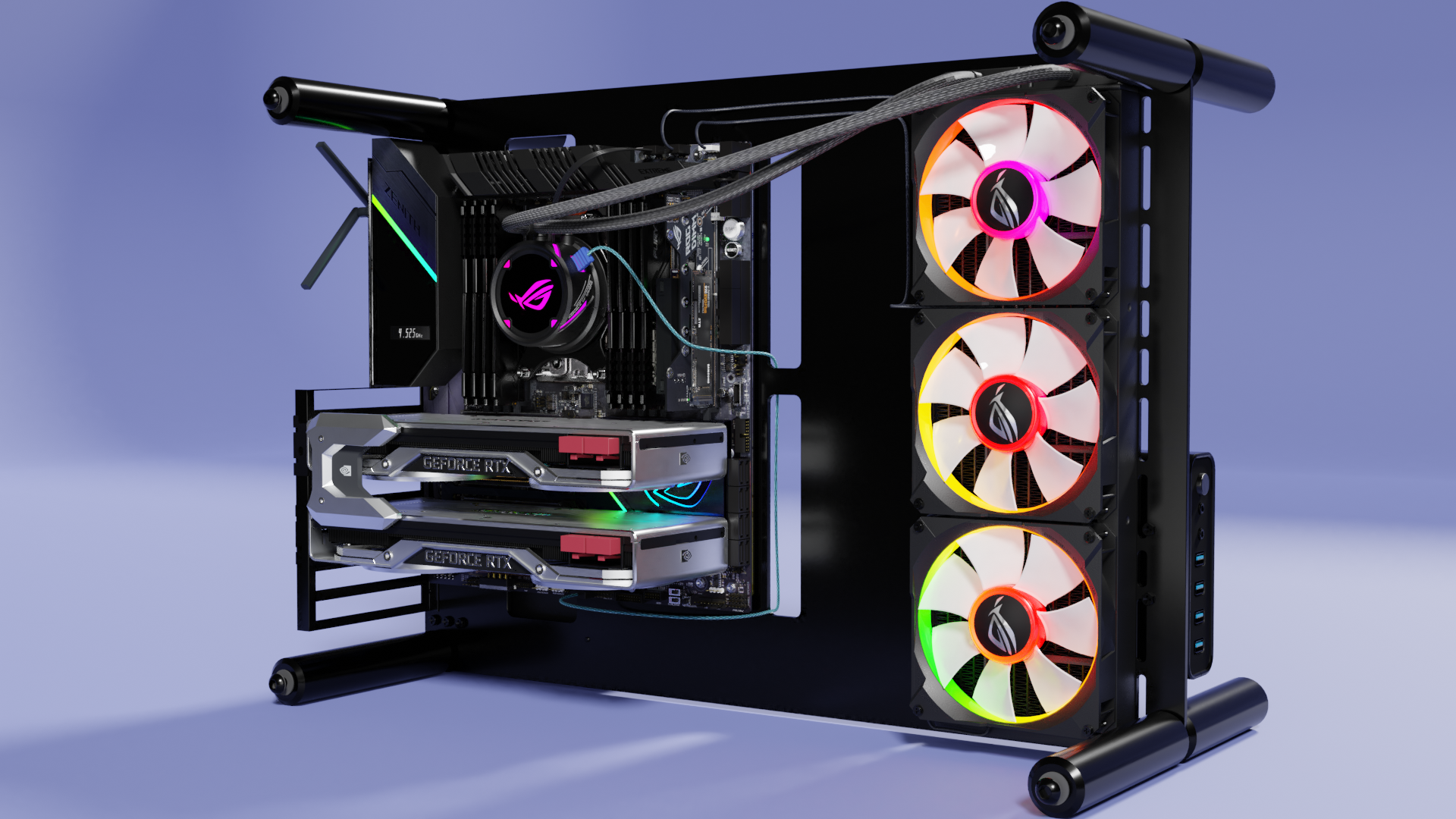 Reijintek PEAN, ASUS ROG Zenith Alpha, NVIDIA RTX 2080ti, ASUS ROG TOHR 850W, ASUS AIO ROG strix LC 360 RGB and SAMSUNG 970 EVO Plus a Blender 3D model.