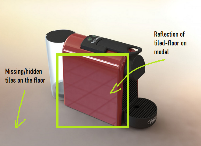 (----See attached picture----) I was going through your profile and saw this "tiled-floor" reflection on the Coffee maker model. And strangely the floor is not rendered that way. So, here I am guessing some setup fault probably - like you are not using the Environment in render settings.