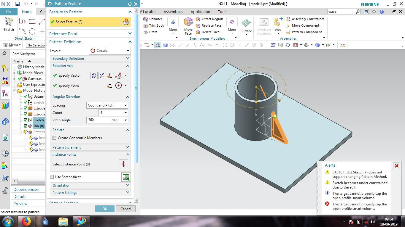 By using Pattern Geometry we can make circular pattern of rib in 1st attempt