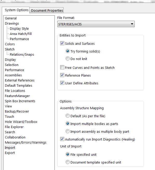 my solidworks opens other files stp,iges etc, only as assembly with no parts.