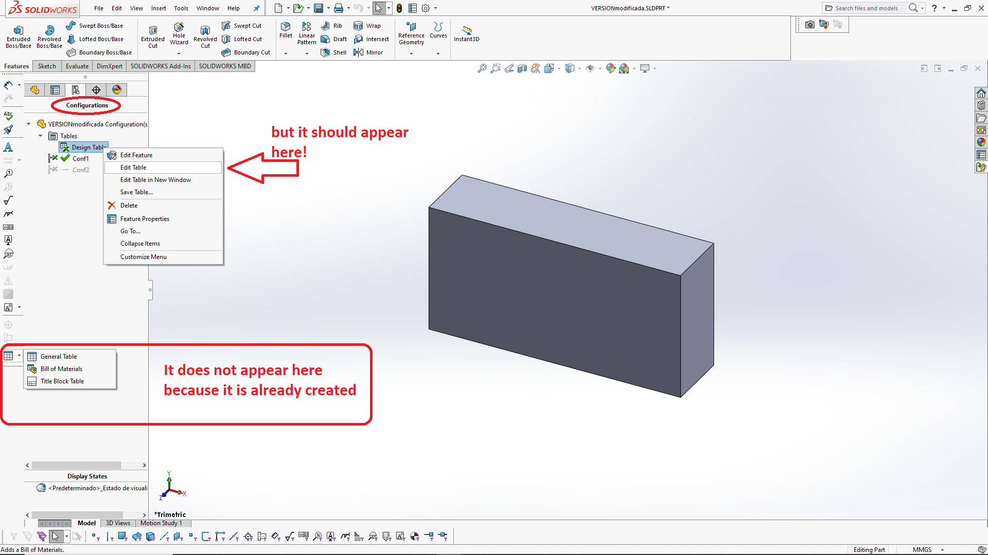 Of course, the "design table" option does not appear because you already have one created...