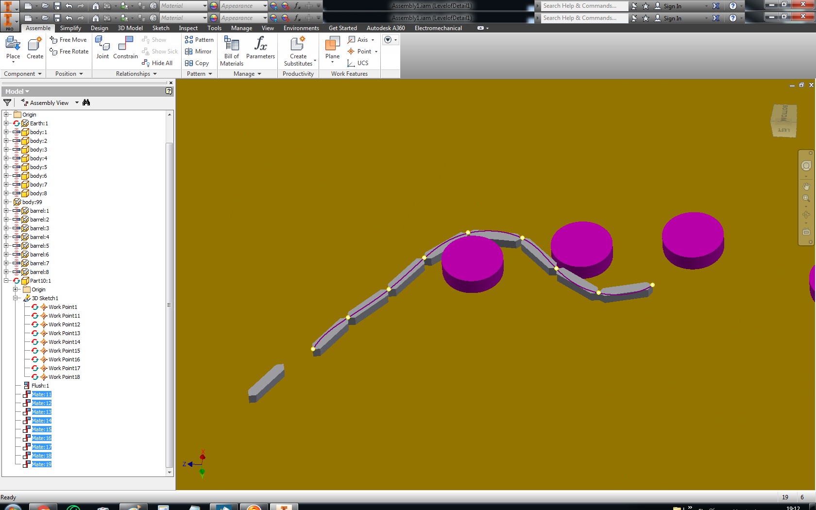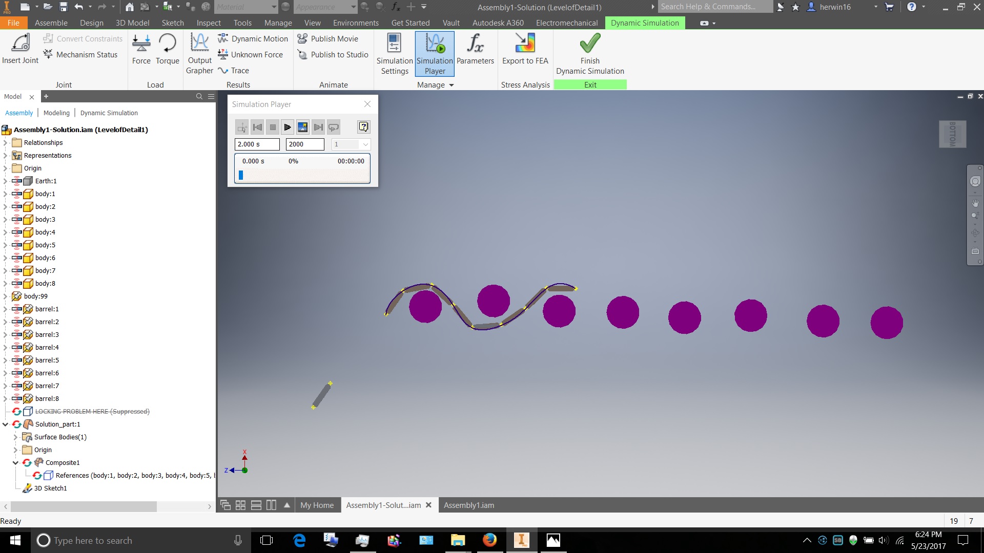 I renew my question. I try to be as specific as possible. Problem is with IV2016 Dynamic simulation. I have 8 bullets and the first on is about to drive. Rest bullets follow with rotational joint. There is 3D contact joint between barrels and bullets.