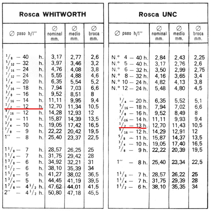 Por lo que entiendo, SW usa en pulgadas la norma UNC, que tiene 1/2"-13 y yo necesito la norma Whitworth que usa 1/2"-12 (porque es más común de conseguir tornillos.