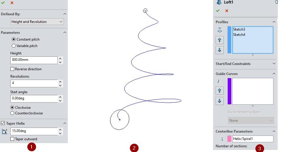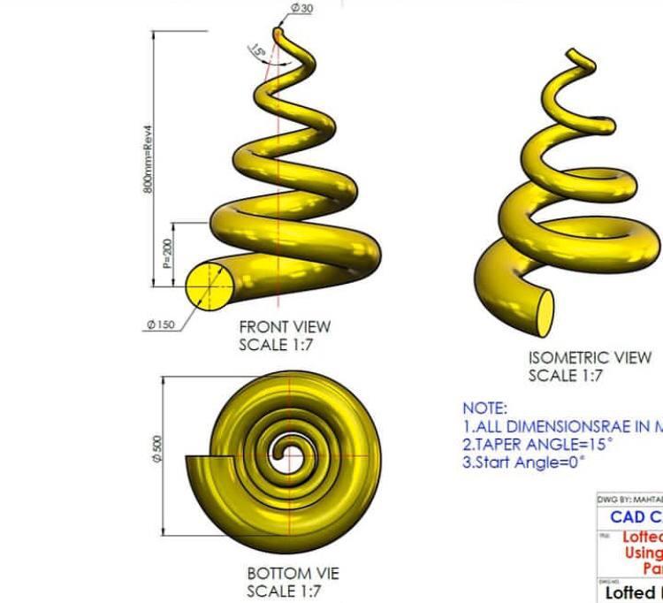 1. Create a Helix/Sprial with 800mm Pitch and 4 Revolutions (Use the Taper Angle from the drawing)