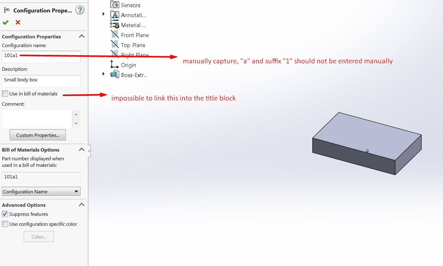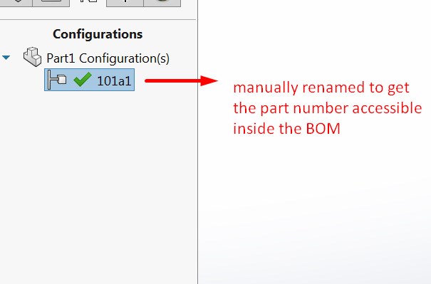 2- The part number, while in configuration property, is read from the configuration manager, by renaming the value inside the configuration manager. That means that the extra information link to the part number like the major revision "a" and the version "1" inside the part number must be done manually.