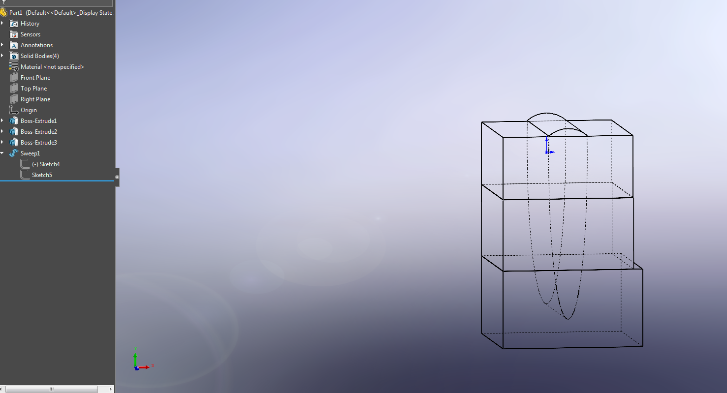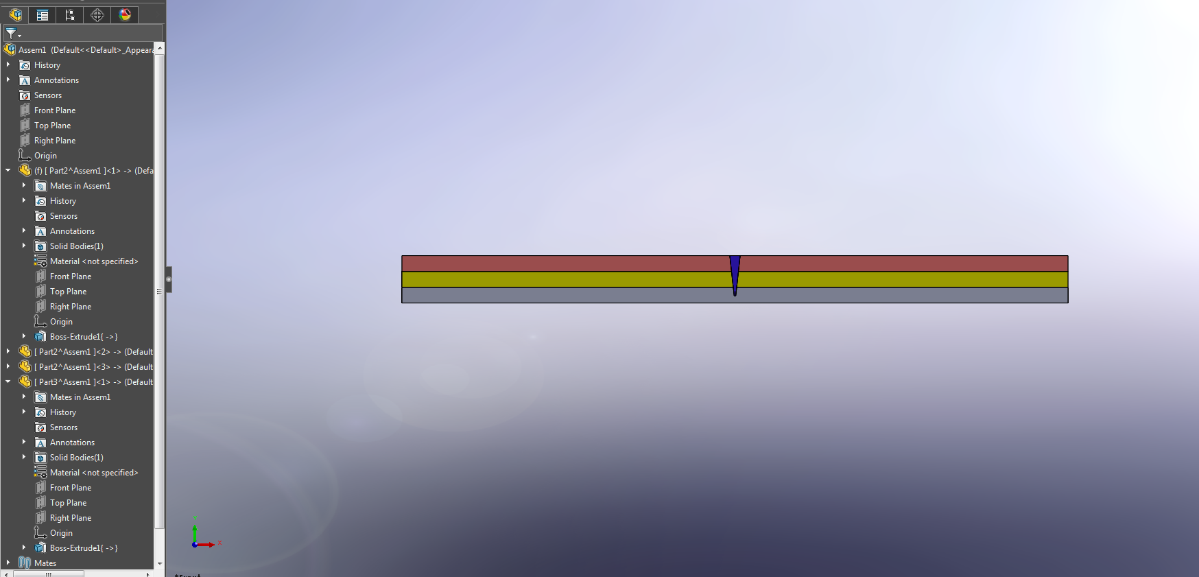 Can someone please explain how to replicate this in solidworks? It is a multiple lap joint. I need to make it so that the weld feature runs through all three parts. It is part of a school project on friction stir welding.