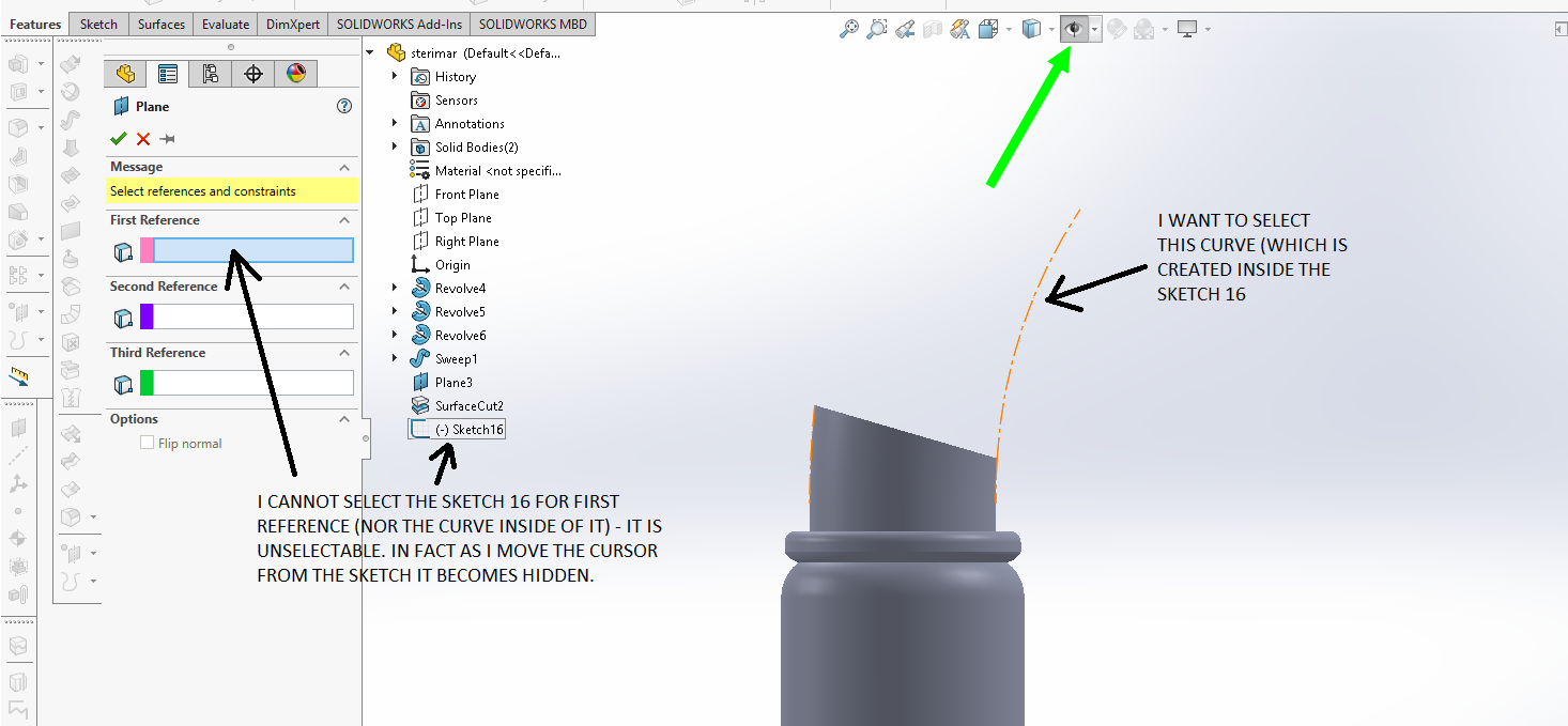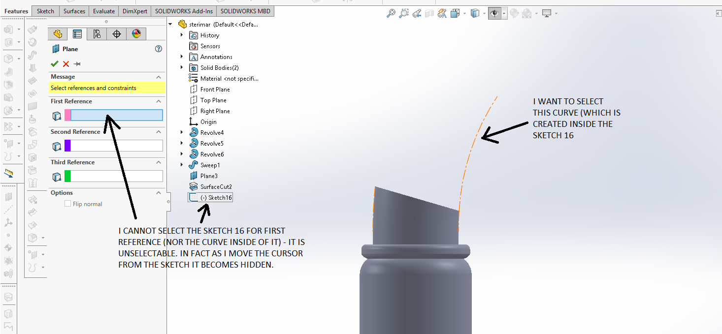 Cannot select object below a sketch for reference plane construction (SW2018)