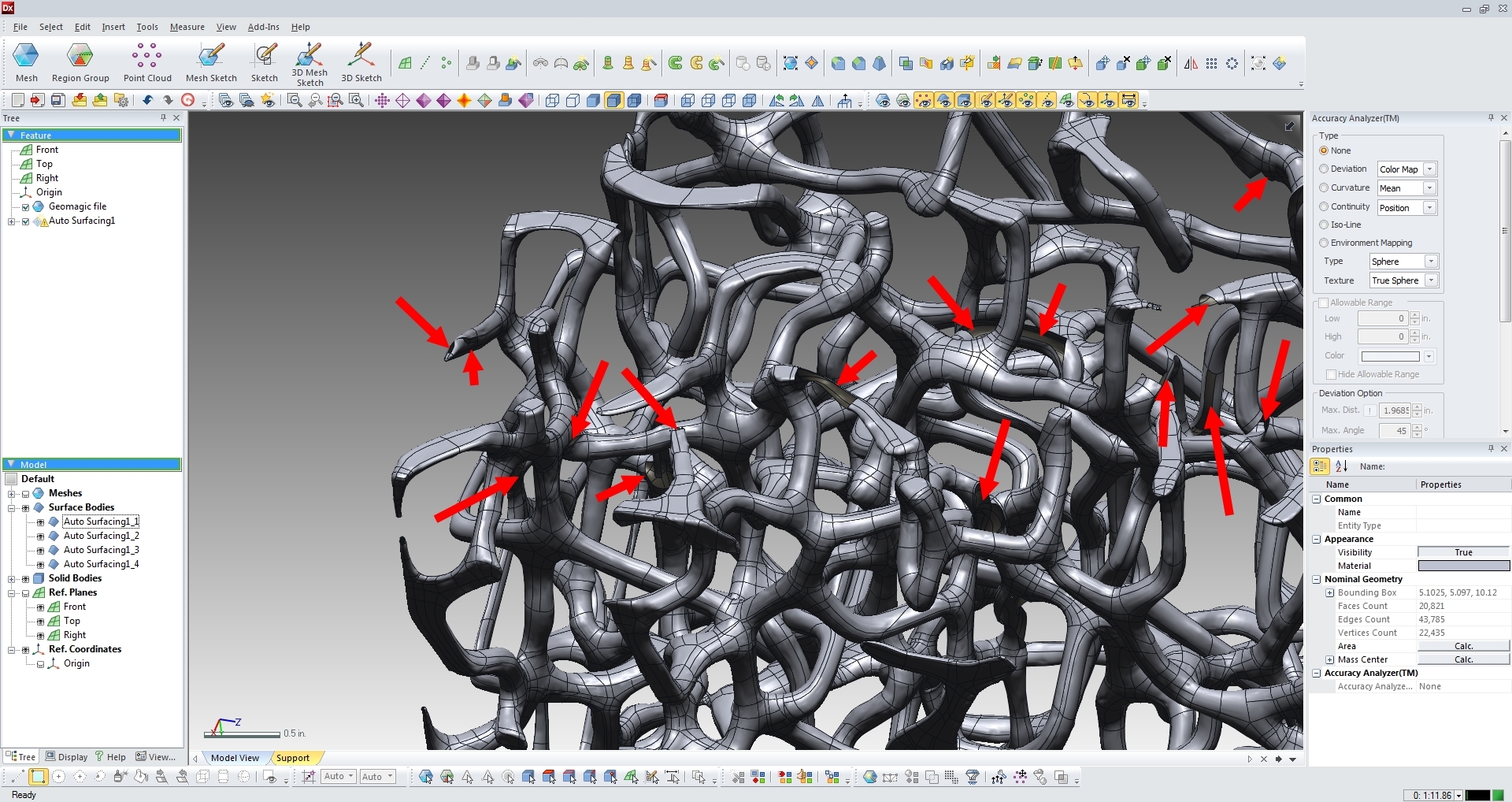 The Design X image shows a number of gaps that it is unable to form a surface over. I've marked the locations with red arrows. If these were holes in an STL file they would be difficult to repair. Fixing these holes in a surface model is more difficult.