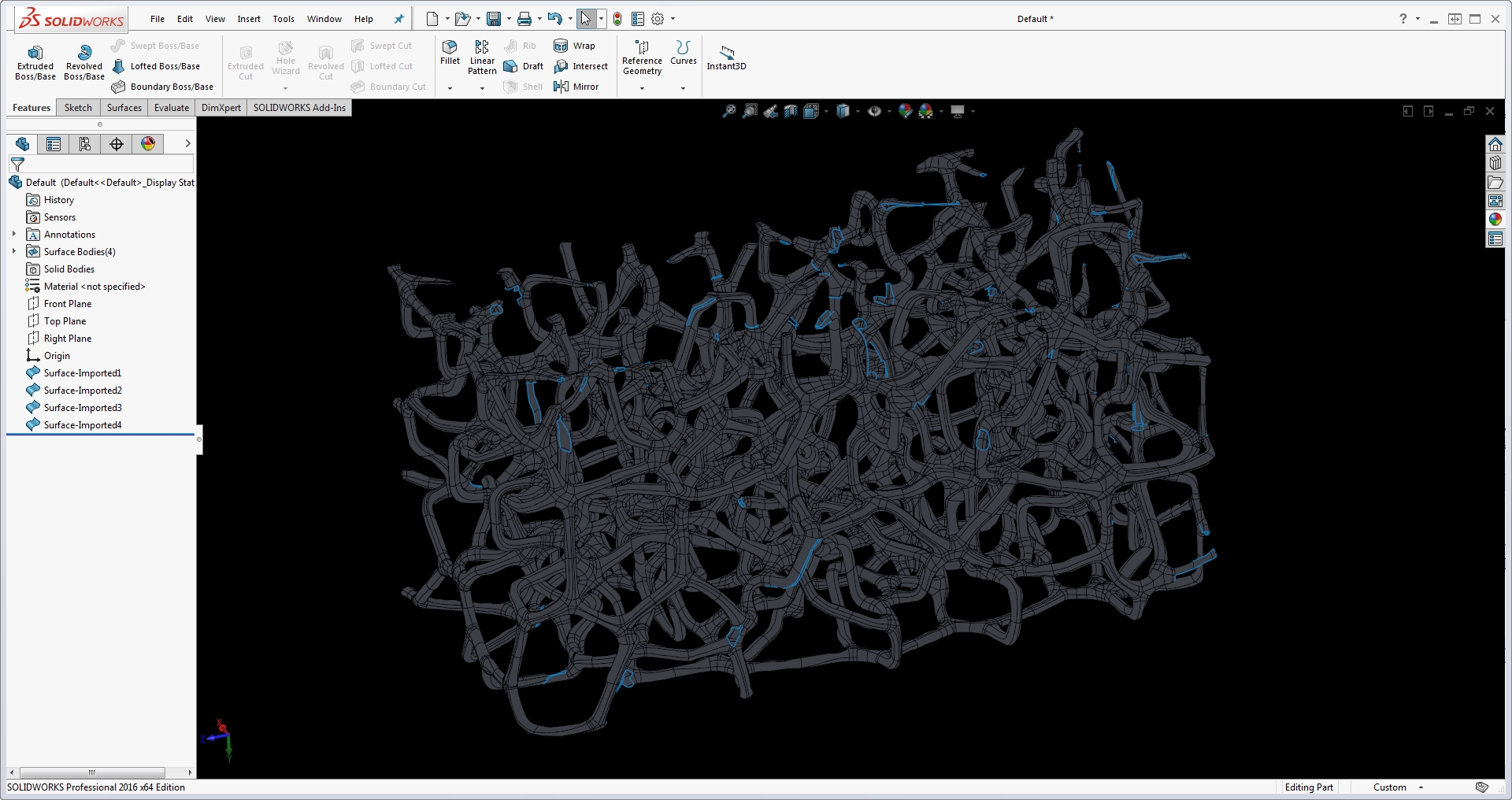 Exporting the Design X surface as an IGES file allows it to import into SolidWorks. Here each blue edge in the image is an open gap.
