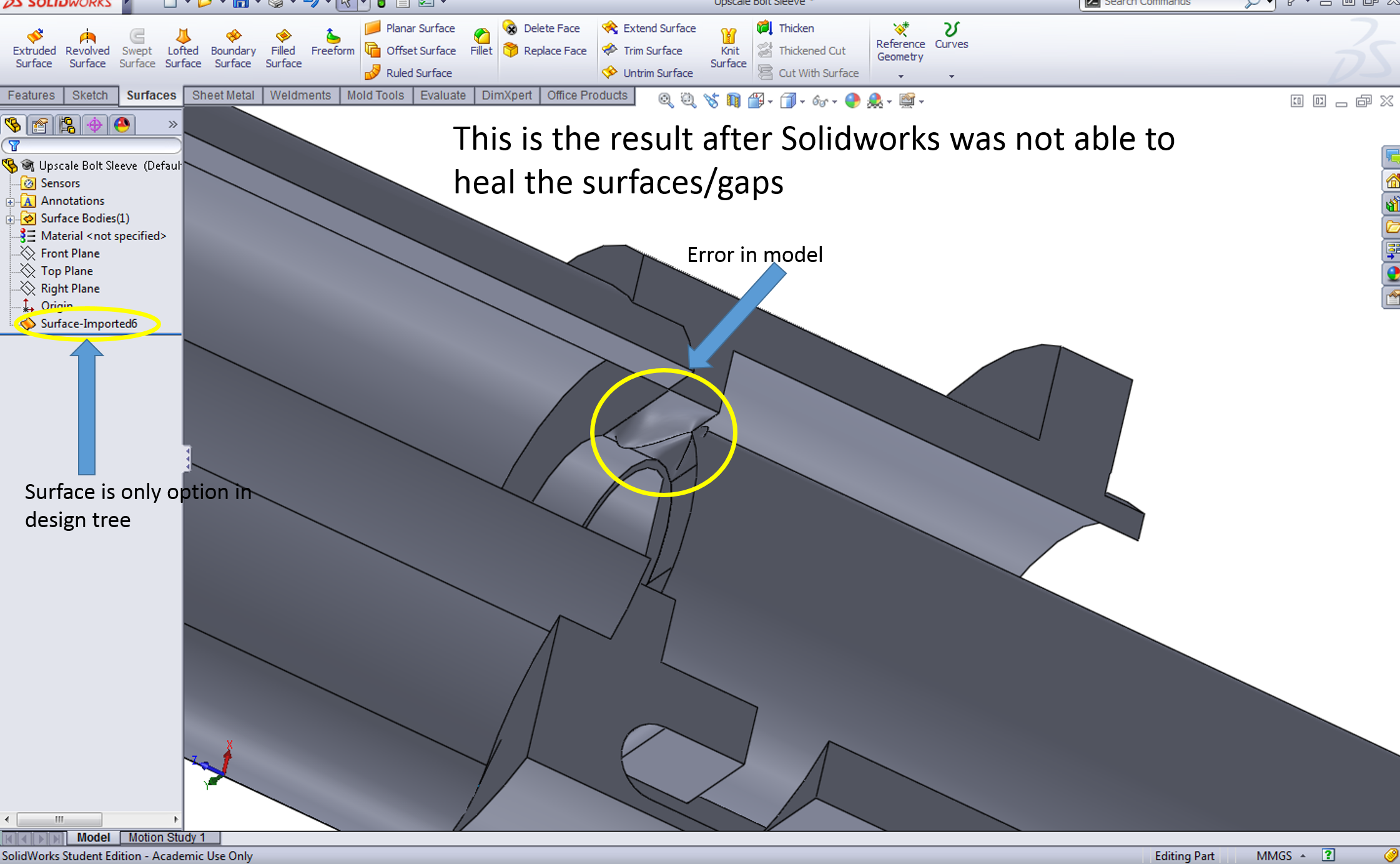 Hello everyone. I'm converting several models from .ipt to .sldprt by saving the .ipt as IGES and/or STEP files, opening in Solidworks then saving as .sldprt. This is working for some parts, but not all. I'm running into issues with Solidworks not being able to heal some surfaces and gaps. I noticed when Solidworks can't heal the surfaces/gaps, the imported part becomes a surface model and NOT a solid model. However, I NEED solid models. Any ideas? Can Autodesk Inventor save as .sldprt or .prt or an other extension that Solidworks can use?