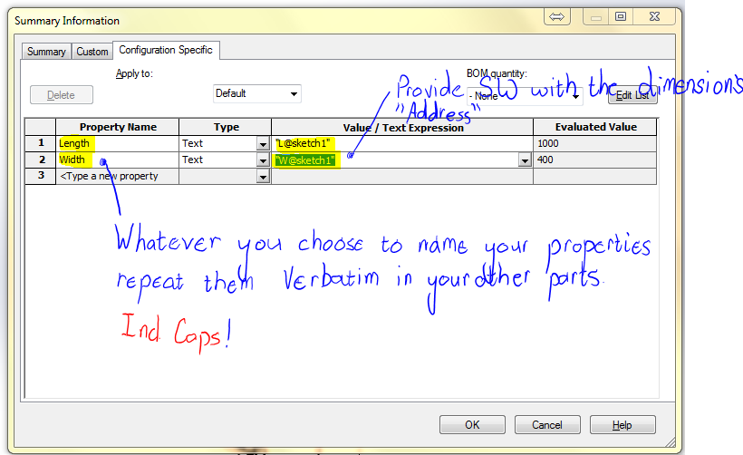 2. Create commonly named custom properties (necessary this time) and direct sw to look for the dimension using the previously assigned dimension names as part of the pointer.