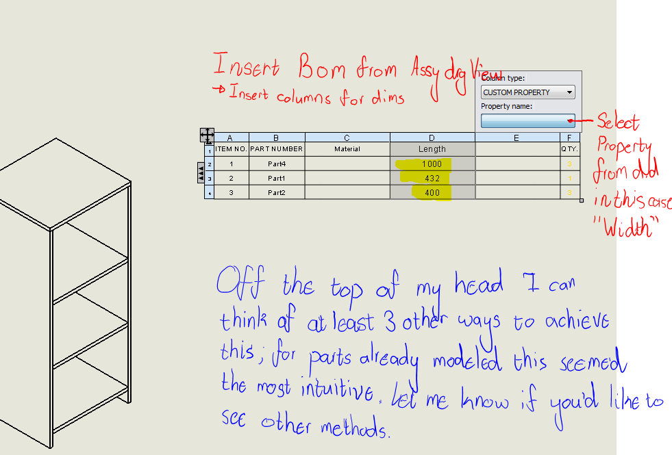 I want to know, if it is possible that dimensions of same thickness rectangle parts in an assembly, is added in B.O.M table automatically.