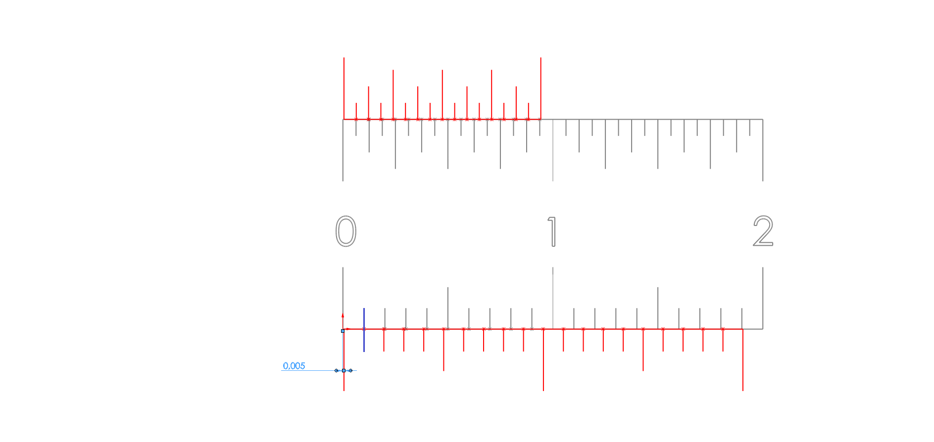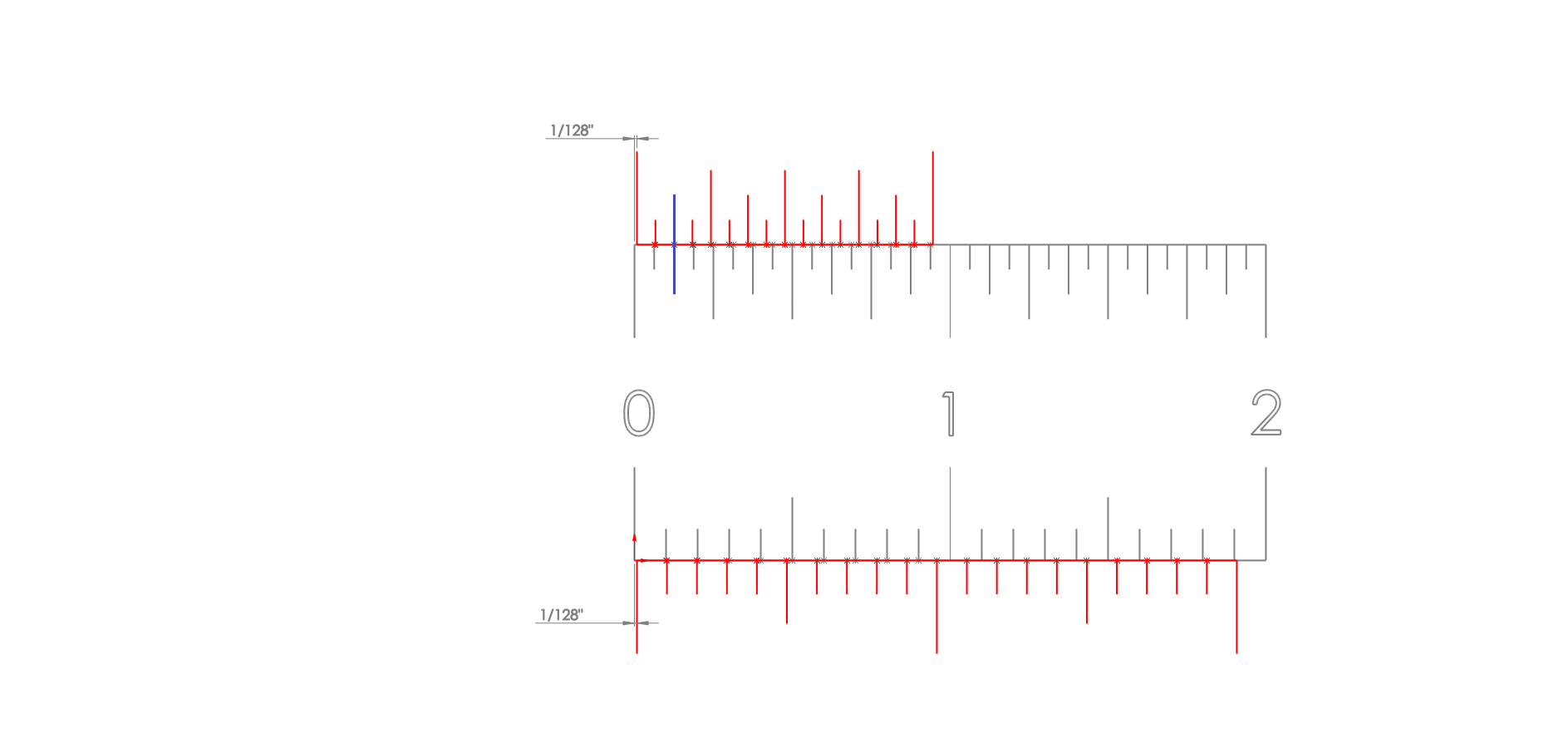 I am attempting to draw a depth gauge for my table saw that I can use to set the blade height and cut width from the same measurement. I think I have drawn a vernier with 1/128 inch resolution correctly. However, I am trying to draw another Vernier at .005 inch resoluition and I cannot get it to read correctly.