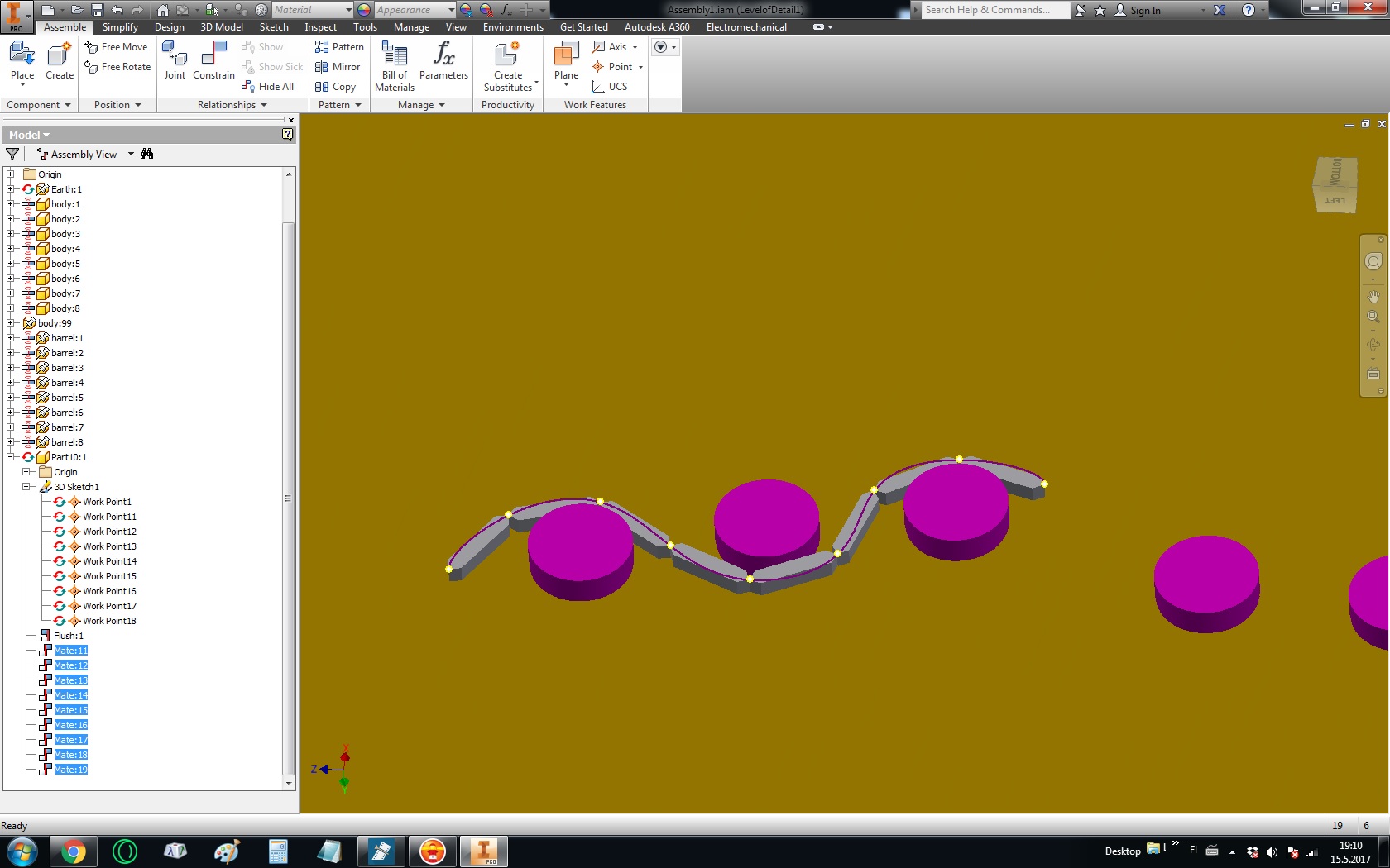 I have eight gray "bullets" and some barrels. Bullets and barrels have 3D contact joint. In assembly I try to make new part. Idea is that new part is a spline following highlighted edges of bullets. Pic 1 and 2 show how I want the spline to behave.