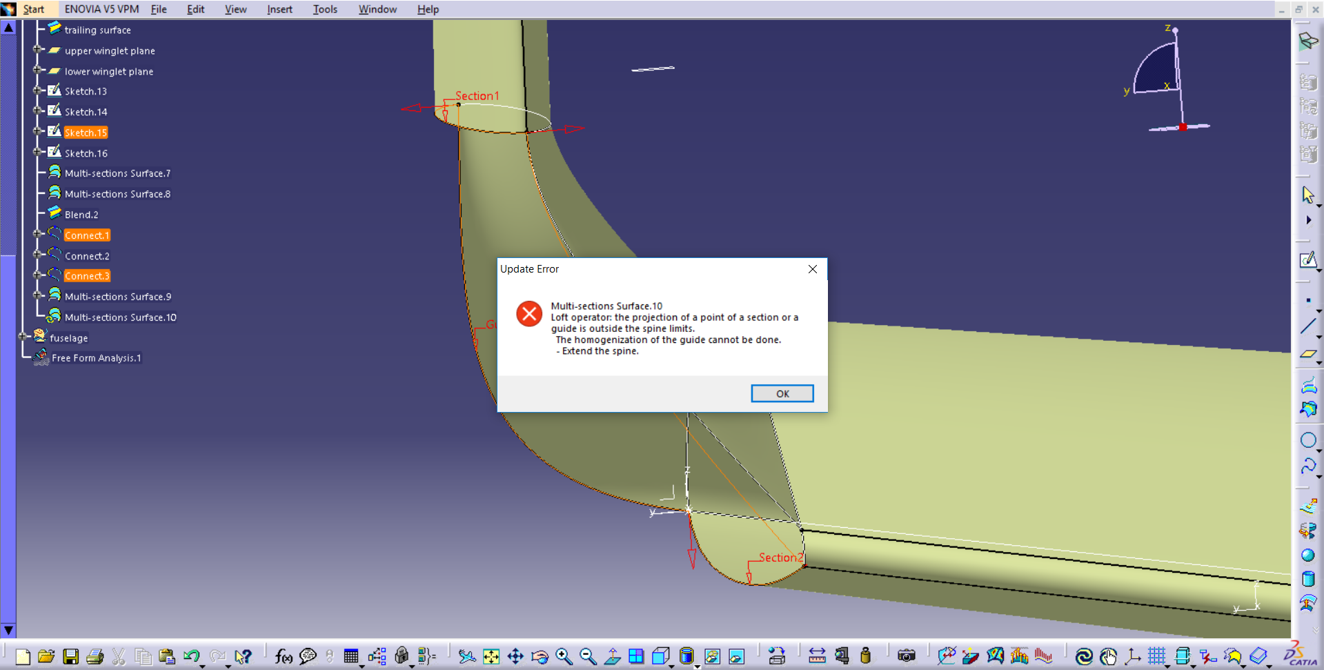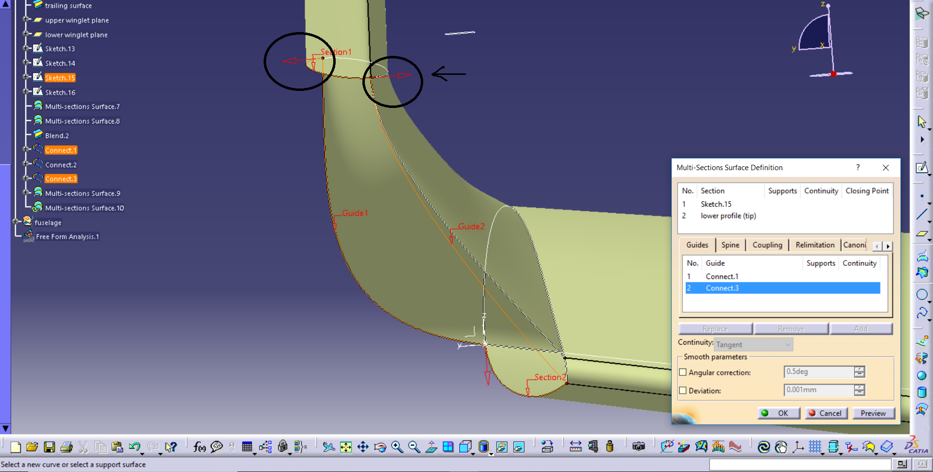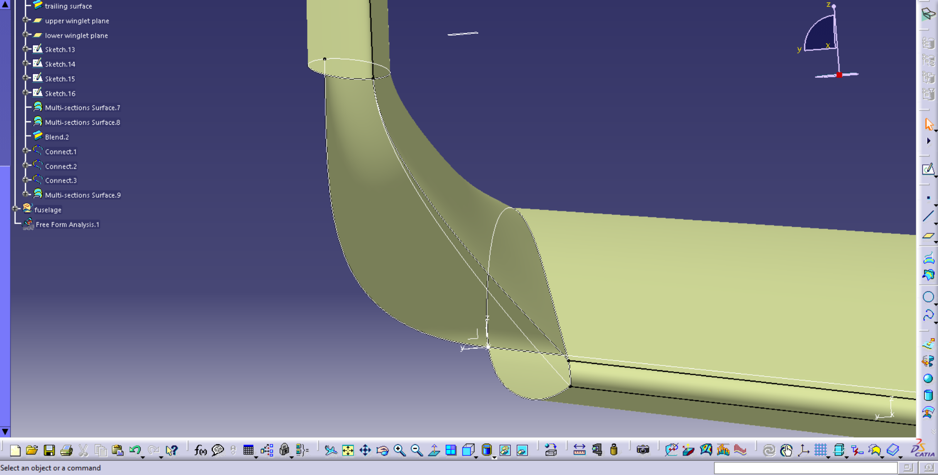 I face problem when trying to join the two surface together. The upper surface was done exactly like what was shown in the pictures. It just so happens that the bottom part cannot be connected. I keep getting errors like this. Anyone has any idea on how to blend the winglet to the airfoil as blended as possible?