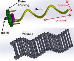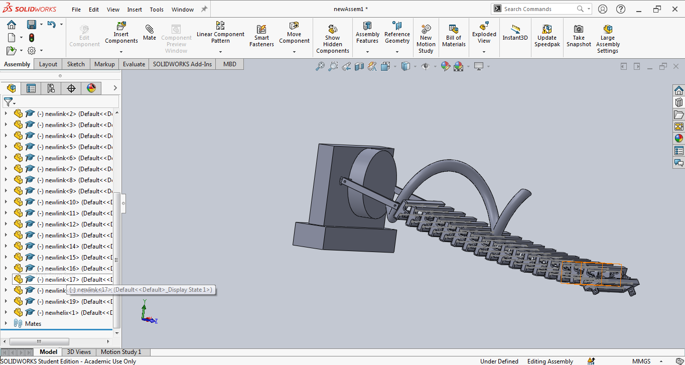 We are working on a mechanism called a single actuator wave-like robot. It is a robot that can move forward or backward by producing a continuously advancing wave. It consists of a helical or spring-shaped wire on which a series of links is assembled, as the helix rotates the series of links will move in a sine wave shape. For your understanding, I have attached a video and images. From the images attached you can see the series of links are assembled on the helix. We are facing a problem in putting that series of links on to that helix in SolidWorks assembly. I have also attached my assembly screenshot(file name- 3. jpg).