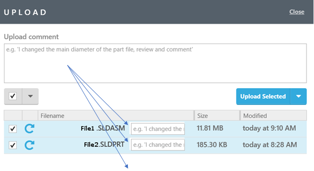- have a textbox assigned for each file that is being uploaded to be able to comment on the specific changes made to each file (part, drawing, assembly).