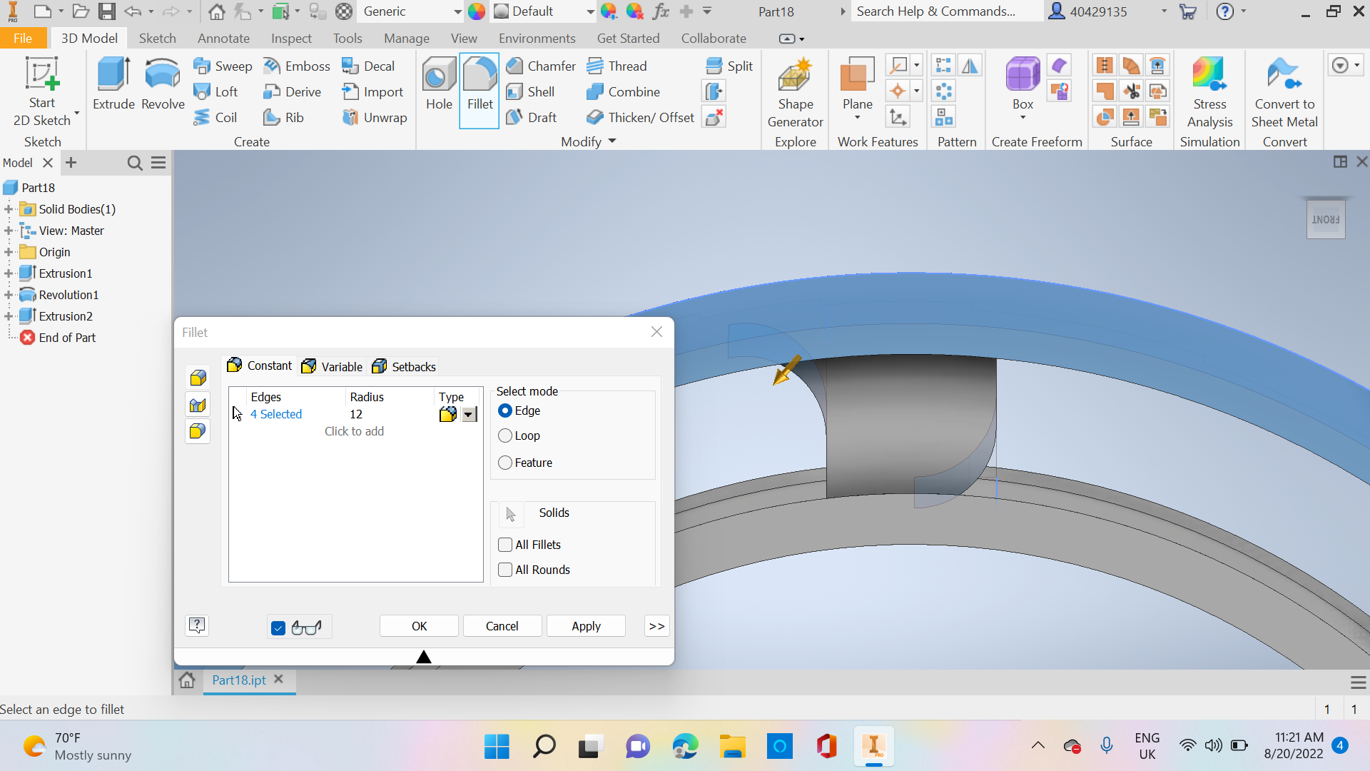 Hi there, I was wondering if anyone could help me with something in inventor 2020, I have created a Bearing and I have created a rectangular solid within the bearing and I am trying to fillet all 4 corners of the rectangular solid to create a round ball bearing. After I create the first fillet to the desired angle when I go to do the opposite side of the rectangular solid the fillet function creates the fillet in the wrong direction, I have tried to resolve this for a few hours now to no avail could anyone help as this is really frustrating.