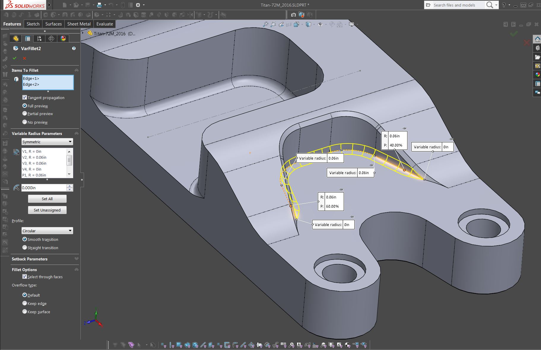This one is kind of a booger. The closest I've been able to come to looking like the model in the PDF is by using a variable radius fillet. I'm not sure how nice that plays with a machined part though. Also I changed the chamfer on that edge to .025