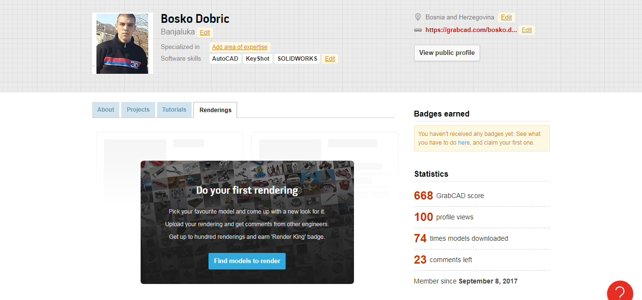 GrabCAD Renderings?? Bosko Dobric 10 Feb, 2018 11:56 PM So how to get renderings in the render tab on profile and.. do I get points for that.. I just pick model, render it and upload somehow there or?? 1 Answer Bosko Dobric Answered on 11 Feb, 2018 10:48 AM But where is the button for uploading renders on render tab it just says.. Screenshot_1.png