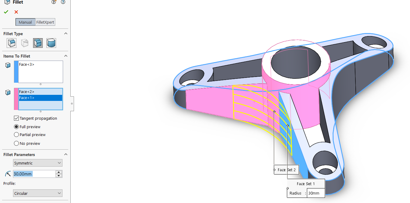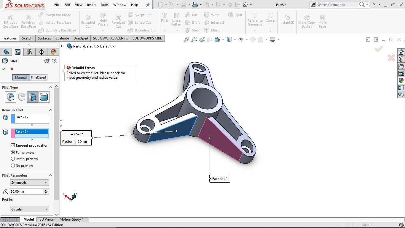 Using Solidworks 2016 after applying 2 face fillet the 3rd one is showing [rebuild error: Failed to create fillet. Please check input geometry and radius value] even id they are of the same value. No matter the approach it shows the same message. Can anyone help figuring out the problem ?