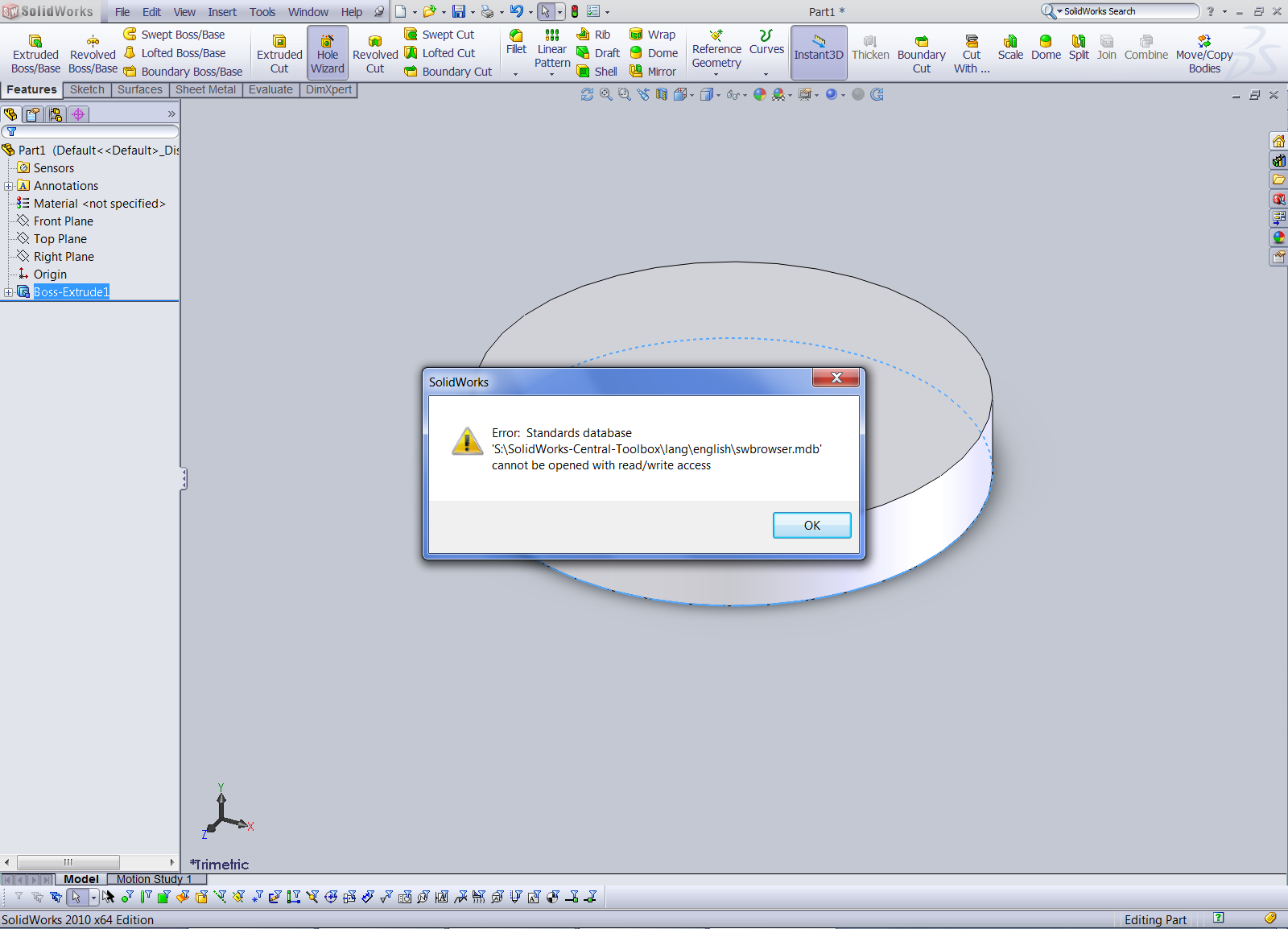 1. The Hole Wizard and Toolbox folder path in System Options > Hole Wizard/Toolbox is not accurate; ensure that the correct path is set and the SWBrowser.mdb file is not corrupt. To test for corruption, rename the existing database and temporarily replace it with the default SWBrowser.mdb file located in "C:\Program Files\SolidWorks Corp\SolidWorks\Toolbox\data utilities\lang\English".