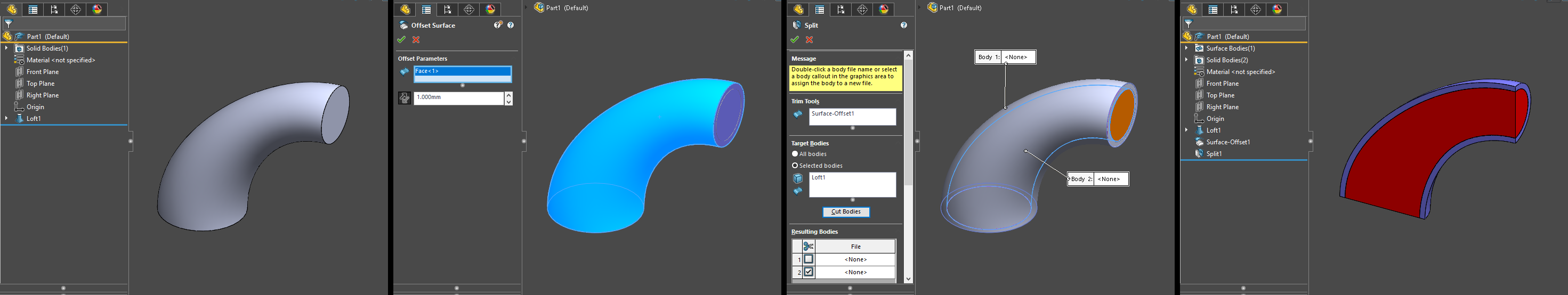 how can i shell body on countour of a solid body divide it into two solids body?