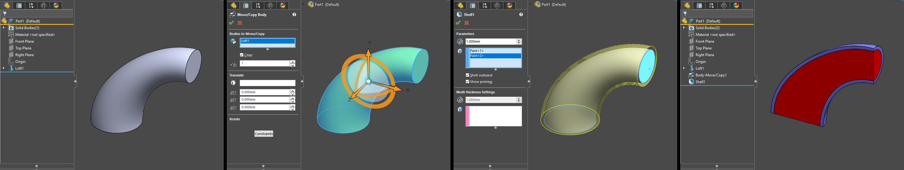 1) Make a duplicate of your part using the "Move/Copy Bodies" feature without setting any rotation or translation, then using the "Shell" feature to make the thin shell, but remember to set it to "Shell Outwards".
