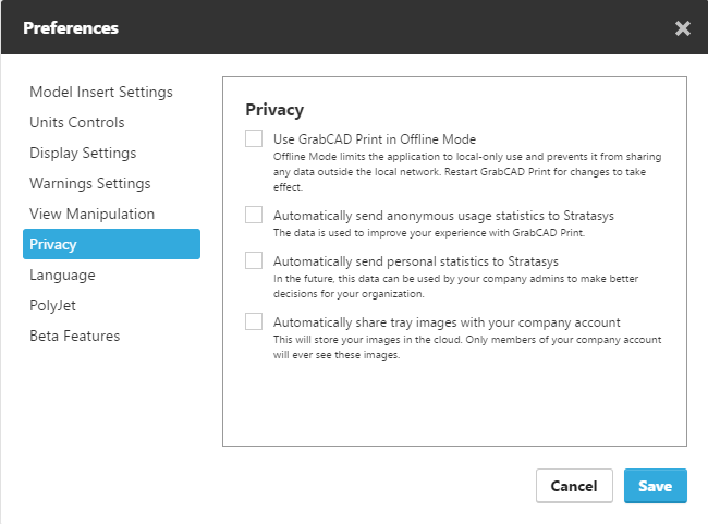 2. Check the checkbox that says "Use GrabCAD Print in Offline Mode". I have added a snapshot of the preferences panel.
