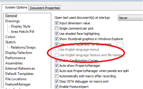 The drawing and part file are in Chinese language; the feature names and every thing. How can we change the language of features? I tried to change the language in "system options". But the language changing icon is in suppressed condition!!!!!!