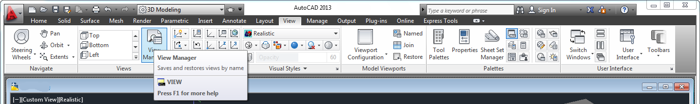 In the 3D Modeling workspace click on the View tab of the Ribbon. Locate the Views panel. Click on the icon for the View Manager.