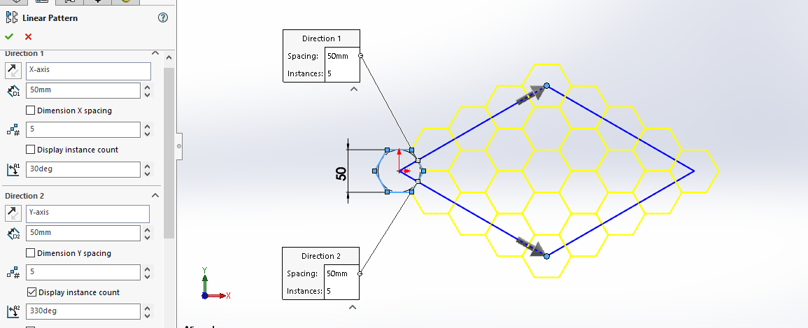 You can use linear sketch pattern to create your honeycomb pattern. You need to do some simple calculation. Say you draw a hexagon with a known distance 50mm between two sides. Then you select all 6 lines and pattern them in two axis using linear sketch pattern. Now here the thing to be careful is angle , so for one axes give angle as 30 deg and other 330 deg. Then give multiplication factor on instance output box. And You are good to go with the pattern. In the attached pic, you may find the clear inputs for linear sketch pattern.
