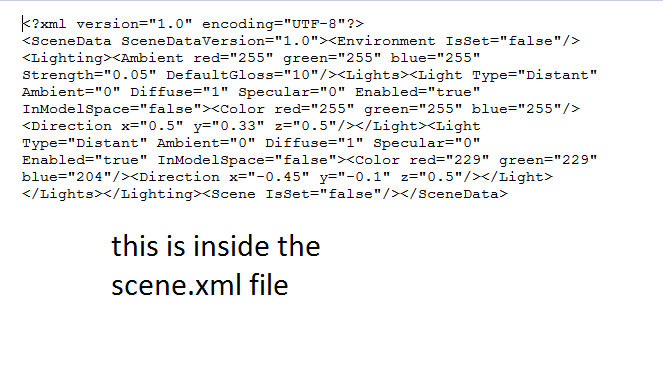 a scene file called scene.xml I got it from a factory in china check the attachment for how the folder is structured