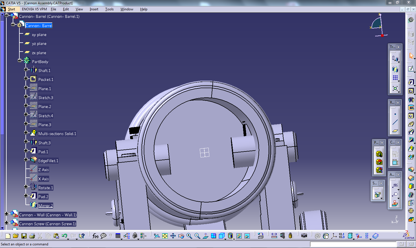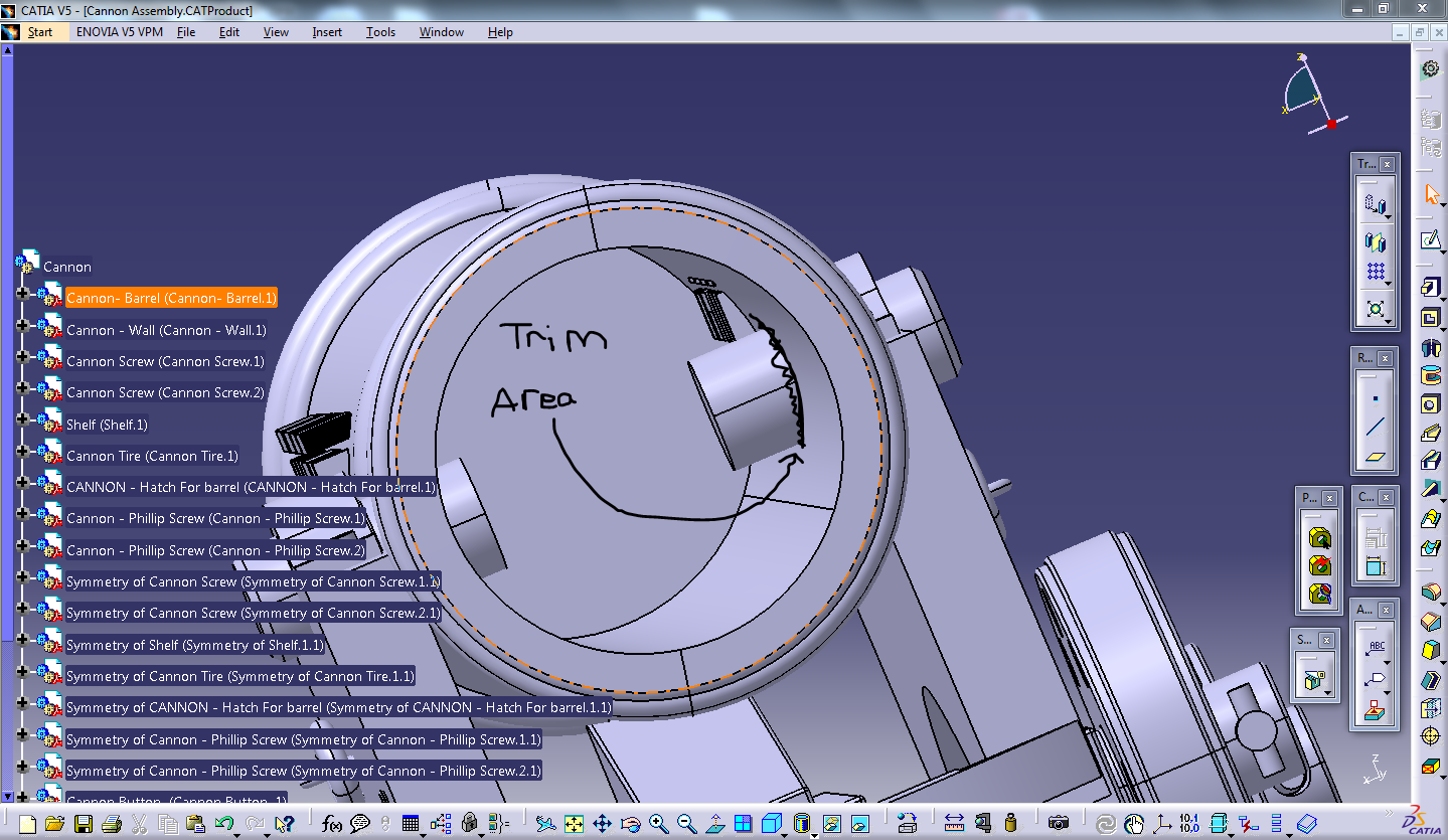 How do i trim 2 intersecting 3D objects in Catia V5 I have tried to pad the objects to up to next but apprently they dont work, I attached a photo for you to see shusuh ka 31 Jul, 2015 09:37 PM I am trying to trim 2 3D objects. Capture.PNG 4 Answers özgür kesebir Answered on 31 Jul, 2015 10:04 PM Use "remove" command if they are in single part. özgür kesebir Answered on 31 Jul, 2015 09:57 PM Which area is trim area? Please show clear screen shot. shusuh ka Answered on 31 Jul, 2015 10:01 PM The Trim area is shown in black Capture.PNG shusuh ka Answered on 31 Jul, 2015 10:02 PM It is not an "imagine & shape" I drew half of the part then did a revolve