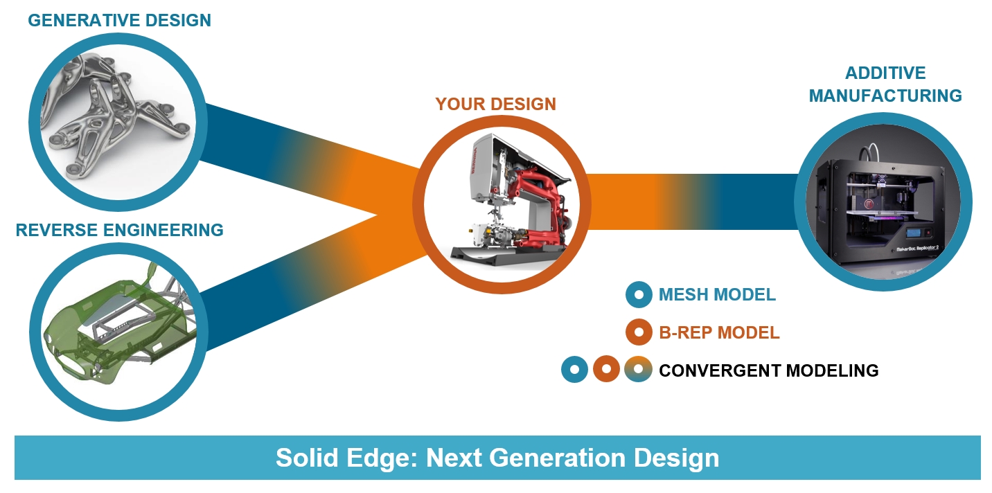 A great technology that we added in Solid Edge ST10 is "convergent modeling". This enables the mesh models created using reverse engineering and generative modeling to coexist with the traditional b-rep models that Solid Edge and other 3D CAD systems traditionally focused on. For example, you can add features to mesh based models using your standard CAD commands, position the mesh models in an assembly, and prepare them for 3D printing.