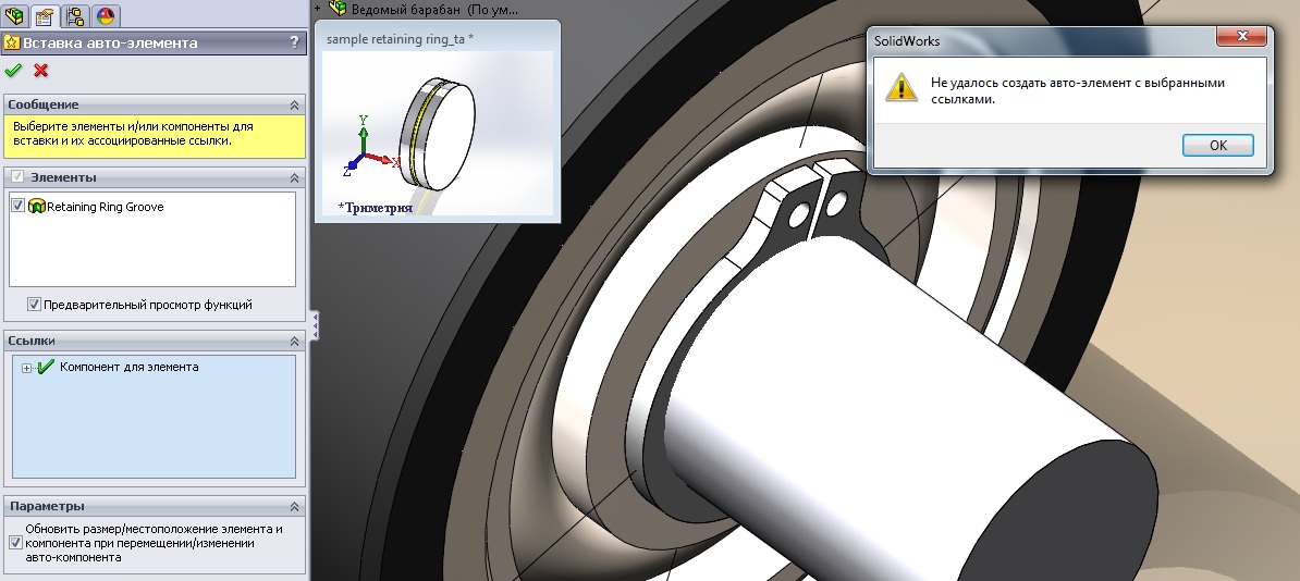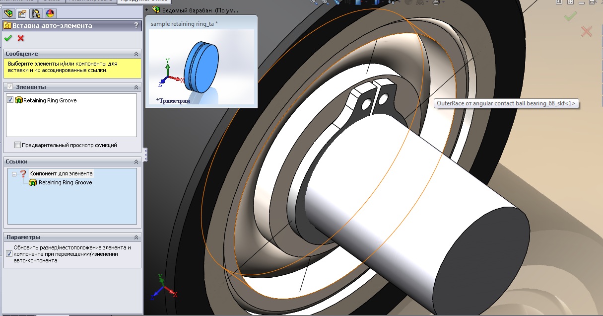 A preview window appears that highlights any reference faces needed to insert the associated components or features.