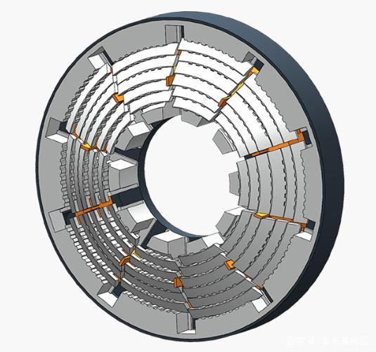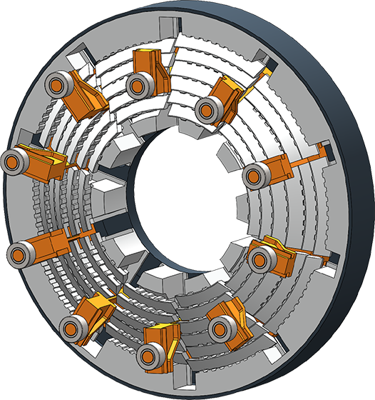 When you turn the outside ring, it pushes the inner sector jaws towards the tool or the material. The rollers help reduce the friction and because there are so much different sectors, the force on the tool is evenly distributed through its surface.