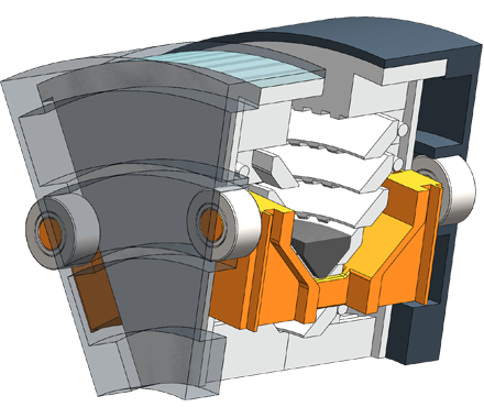 There are components that are not adequately detailed such as the cams that operate the cam followers. To me it looks like a variable pitch sheave. The sheave faces are segmented both radially and circumferentially. The cam is probably scroll shaped. The fact that the cam followers are in ever increasing distances from the ends of each carrier would fit this hypothesis.
