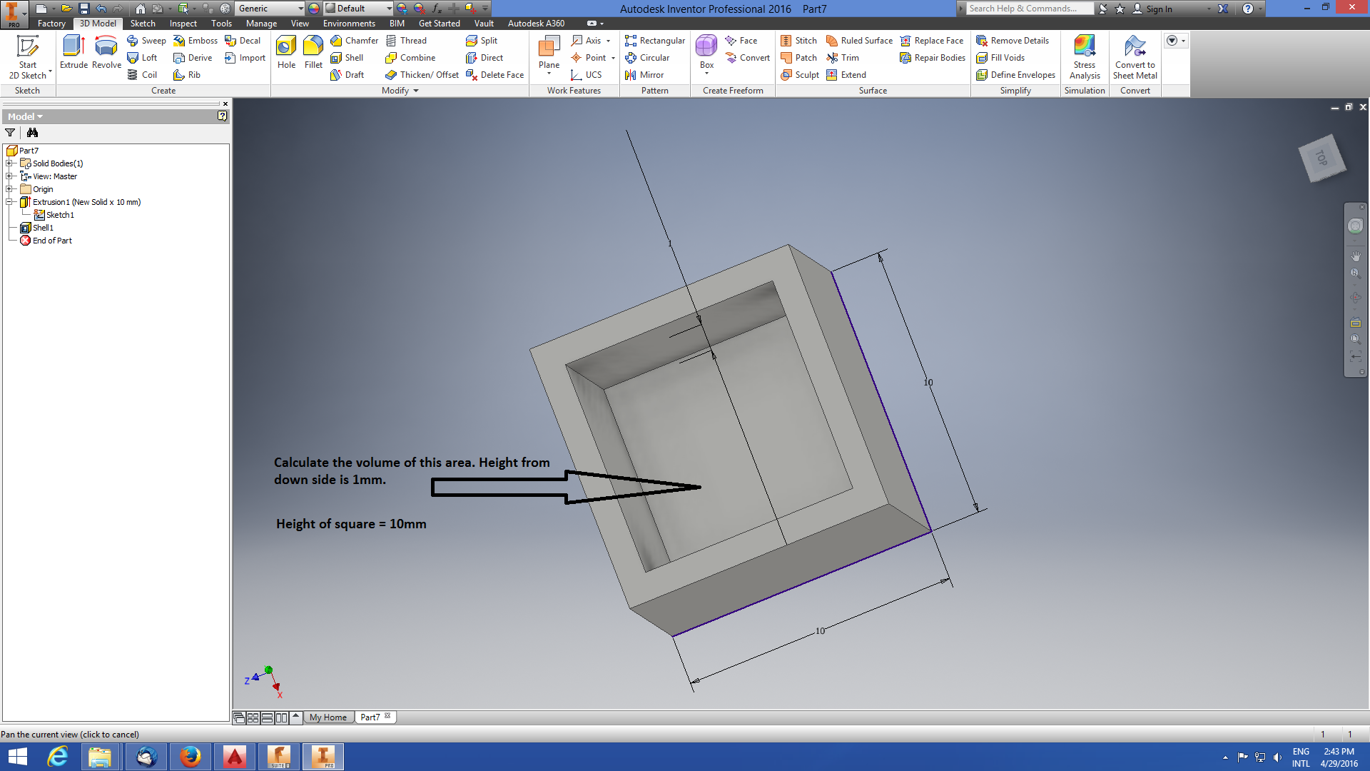 How to calculate volume of square box in autodesk inventor 2016? jaydeep tripathi 29 Apr, 2016 09:18 AM How to calculate square box volume. Untitled.png Untitled.png 1 Answer FredSWUG Answered on 29 Apr, 2016 11:46 AM 8*8*9 = 576 cubic units