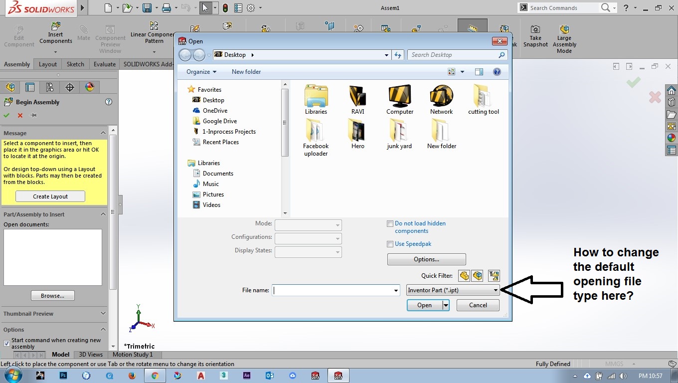 once i have inserted a inventor file in sw and from then my default file type for inserting a component in assembly automatically set to inventor file(which was previously .prt) Please check the attached image. i hv checked all over internet but didnt find any solution. can anyone help, Is there is any way to change it againg?