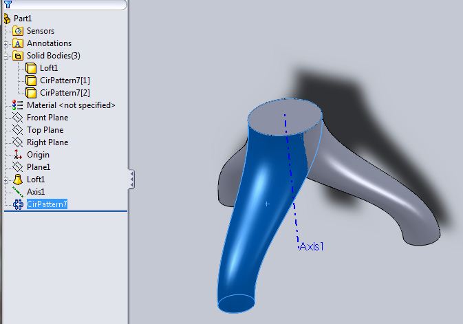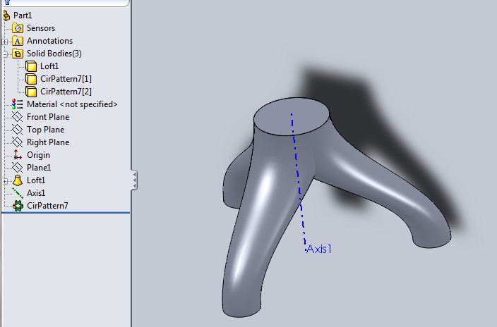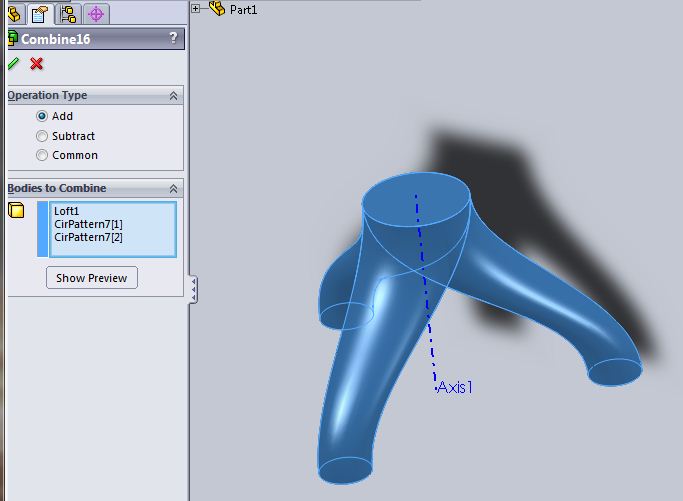 I created a loft and i used circular pattern on it, as a body, and when i try to use combine option i get an geometric error or just one leg remains the other 2 are erased